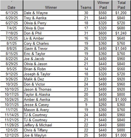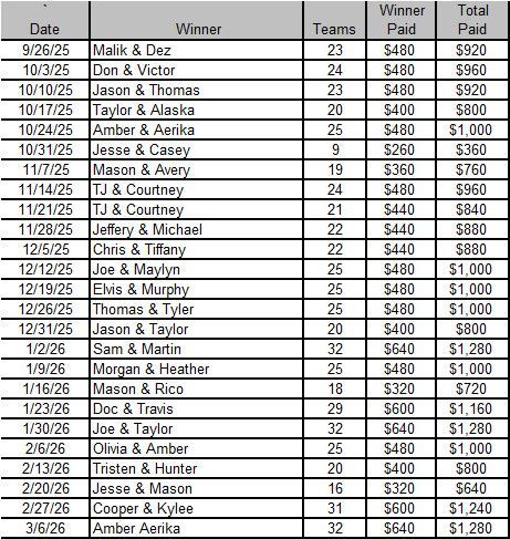 - 7:00 Start or When Filled, 6:00 Registration